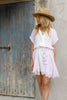 Ses manches courtes et son tissu en rami certifié Oeko-Tex lui confèrent un tombé fluide, idéal pour les journées chaudes. La ceinture à la taille, ornée de liens avec petits pompons, structure délicatement la silhouette. Enfin, la dentelle qui habille le bas de la robe ajoute cette touche bohème signature des créations Les Néobourgeoises.